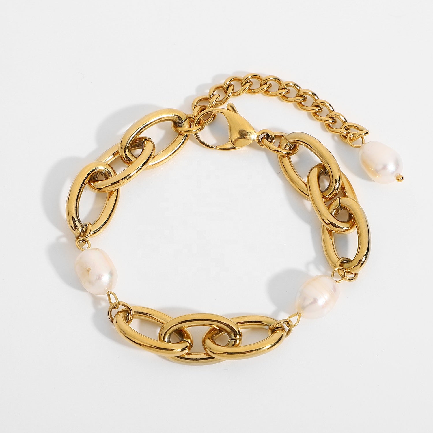 This Pearl Golden bracelet is a versatile minimalist piece that goes with any look. It has a few pearls and a chunky link chain. Wear it with another bracelets to create an arm party. You can also linked this bracelet with another bracelet to wear them as a choker or link this bracelet with a choker for a longer length.
